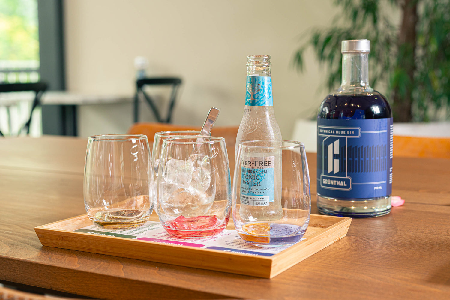 Three Grünthal Gins with matching garnishes, a bottle of tonic water and ice